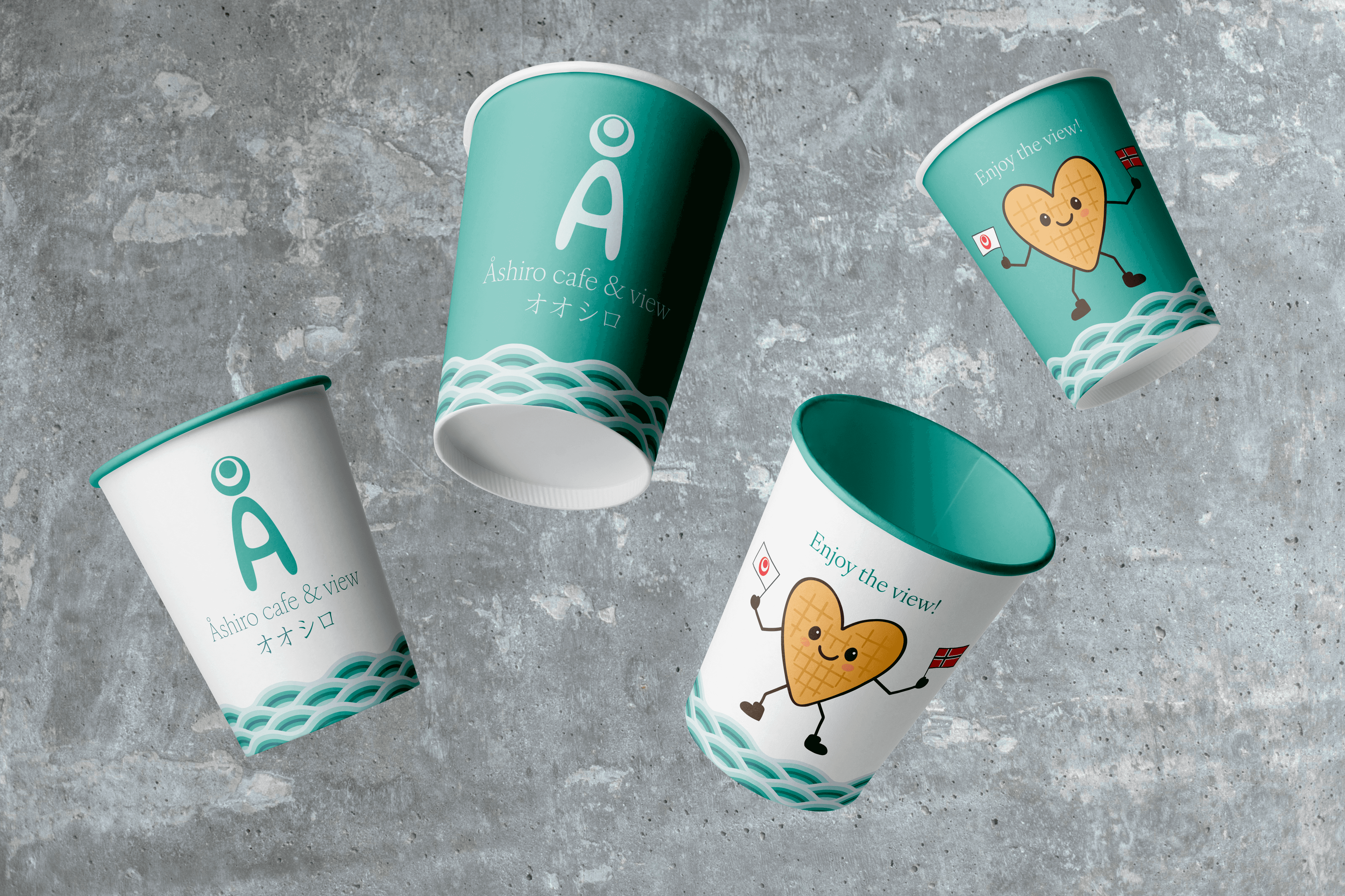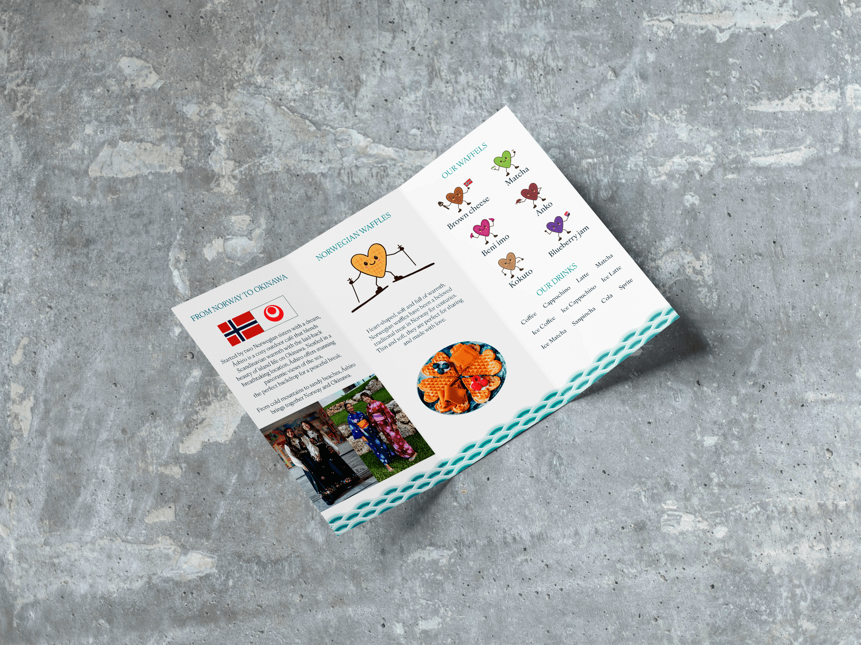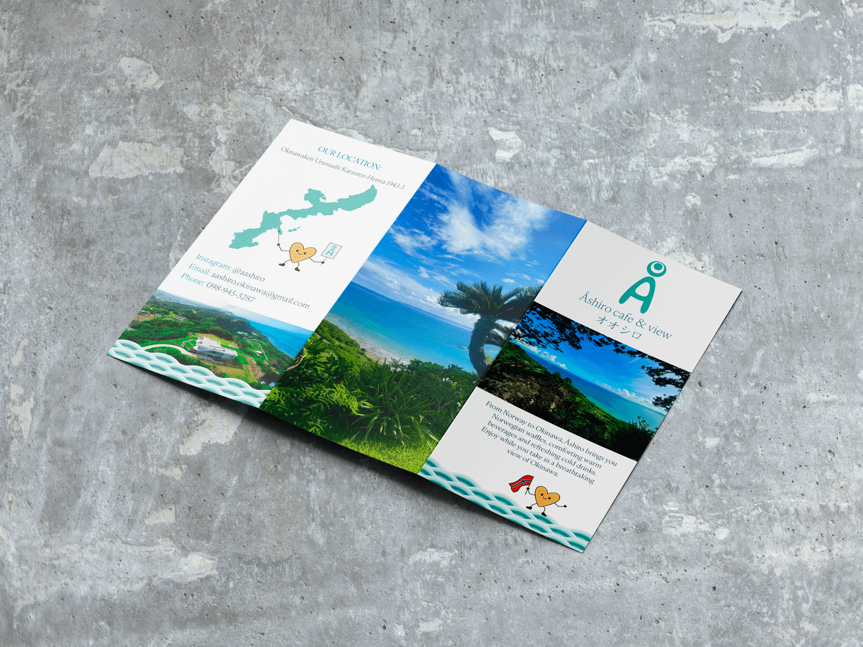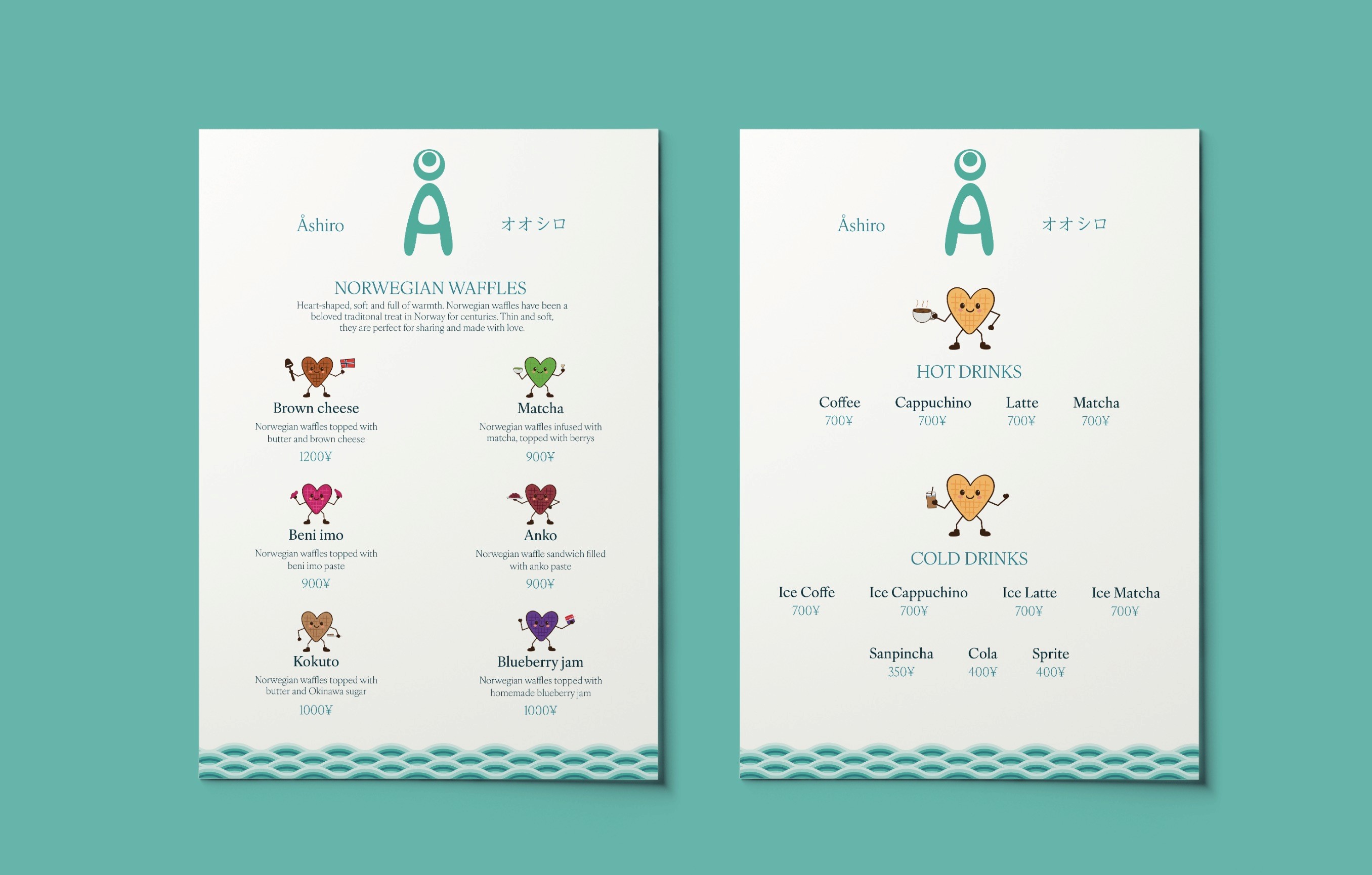 Åshiro is a café concept in Okinawa, Japan opening fall/winter 2025. Åshiro focuses on combining Okinawa and Norway trough Norwegian waffles and a fantastic panoramic view of the sea and island of Okinawa. The visual identity aims to reflect Åshiro’s connection to both Norway and Okinawa, as well as being welcoming and family friendly.
